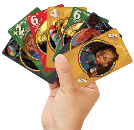 Fans of the terrifying Chucky movies will love this themed UNO card game! It features creepy images from across the horror franchise, and the special “Amulet” rule turns the game into a fight for survival! Each deck also includes a collectible foil card. Makes a killer gift for Chucky fans and card game lovers ages 7 years old and up. Colors and decorations may vary.