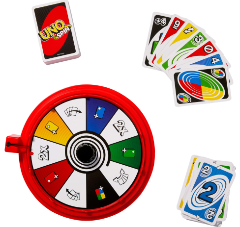UNO Spin puts a different spin on Classic UNO gameplay that’s fun for everyone! Players take turns playing their UNO cards by matching the color, number, or action to get rid of all their cards. When a spin card is played, that player must spin the wheel, then follow the action. Different spin powers like Color Draw, Swap Hands, Color Discard, or Double Spin can be real game-changers especially if someone forgets to yell ‘UNO!’ Includes 112 cards and 1 spinner. Colors and decorations may vary.